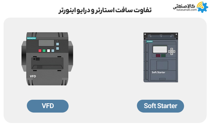 سافت استارتر وسیلهای الکترونیکی است که با محدودکردن جریان و ولتاژ اعمال شده به موتور در هنگام راهاندازی از شوکهای مکانیکی و مصرف جریان هجومی اولیه جلوگیری نموده و به افزایش عمر مفید موتور کمک مینماید. در مقابل درایو کنترل دور که با نام اینورتر یا VFD نیز شناخته میشود، علاوه بر مزایای سافت استارتر با تغییر فرکانس و ولتاژ ورودی به موتور، امکان کنترل دقیق دور خروجی آن را نیز فراهم میسازد.