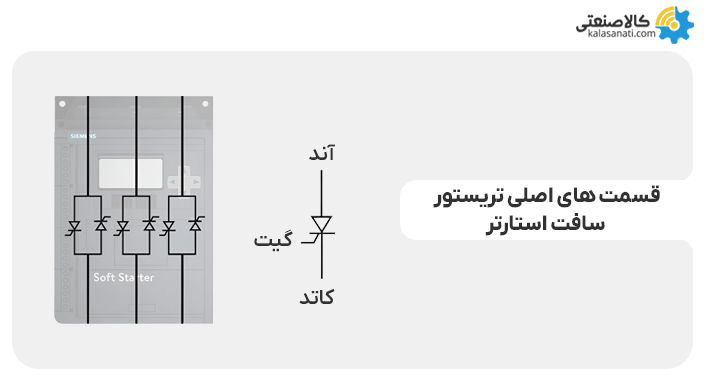 یک سافت استارتر در حالت عادی از 6 تریستور یا «یکسوساز کنترل شده با سیلیکون» (SCR) که بهصورت ضد موازی چیده شدهاند، برای راهاندازی نرم الکتروموتور استفاده میکند. تریستور نوعی سوئیچ نیمههادی است که میتواند ولتاژ و جریانهای AC را در یک جهت کنترل کند. هر تریستور از سه قسمت اصلی (پایه) تشکیل شده است: