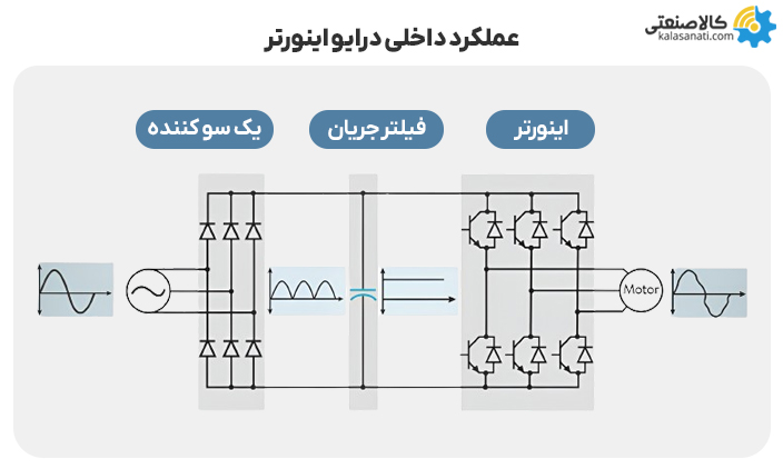 - فیلتر (Filter): فیلتر با استفاده از خازنها، ولتاژ DC را صاف میکند تا موتور جریان ورودی نرمتری داشته باشد.