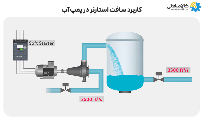 پمپ آب: از آنجاییکه میزان آب ورودی و خروجی به پمپها معمولاً یکسان بوده و نیازی به تغییر سرعت موتورپمپ وجود ندارد، استفاده از یک سافت استارتر برای حذف جریان هجومی و راهاندازی نرم موتورپمپ گزینهای ایده آل به نظر میرسد.