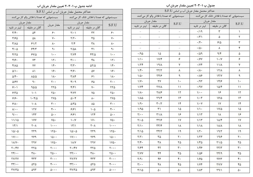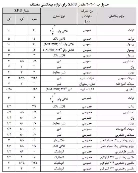 در قسمت پ 1-2 از مبحث 16 مقررات ملی ساختمان مربوط به تعیین حداکثر مصرف لحظهای آب هر یک از لوازم بهداشتی ساختمان با واحد S.F.U در جدول پ 1-2-2 مقررات ملی ساختمان آورده شده است.