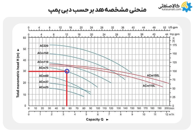 بعد از اینکه مقدار دبی و هد محاسبه و نوع پمپ آب خانگی انتخاب شد بایستی به نمودار مشخصه سری پمپ انتخاب شده مراجعه شود تا بر اساس هد و دبی محاسبه شده مدل پمپ مناسب انتخاب شود. به عنوان مثال برای میزان دبی 55 لیتر بر دقیقه، هد 30 متر و نوع پمپ بشقابی تک پروانه برای پمپ لئو سری ACm از نمودار مشخصه هد برحسب دبی آن مدل پمپ ACm75 انتخاب میشود. جهت خرید پمپ بشقابی تک پروانه لئو میتوانید با کارشناسان پمپ کالاصنعتی تماس حاصل فرمائید.