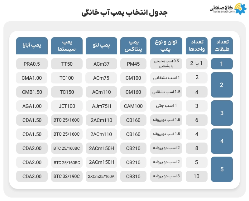 جدول زیر برای حالتی آورده شده که قرار است از یک پمپ آب مشترک برای تقویت فشار آب ساختمان استفاده شود. متراژ واحدها هم در انتخاب پمپ آب مهم است. جدول زیر، انتخابی تجربی بوده و کالاصنعتی هیچ گونه مسئولیتی ندارد. برای انتخاب دقیق و منحصر به شرایط هر ساختمان، بهتر است از کارشناسان مربوطه مشاوره بگیرید. جهت کسب اطلاعات بیشتر درباره بهترین برند پمپ آب خانگی میتوانید مقاله مذکور را نیز مطالعه کنید.