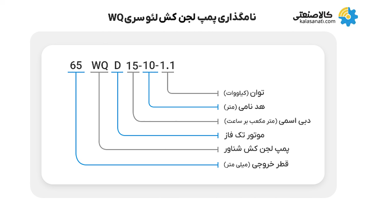 در شکل زیر نحوه نامگذاری پمپ لجن کش لئو را میتوانید مشاهده کنید. مشخصات قطر خروجی، تک فاز/ سه فاز بودن، دبی اسمی، هد نامی و توان الکتروموتور پمپ لجن کش لئو سری WQ در کد فنی آن نشان داده میشود.
