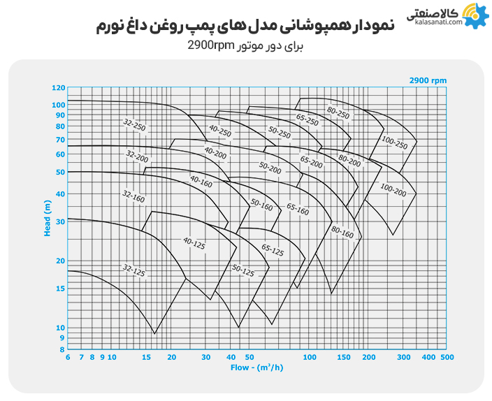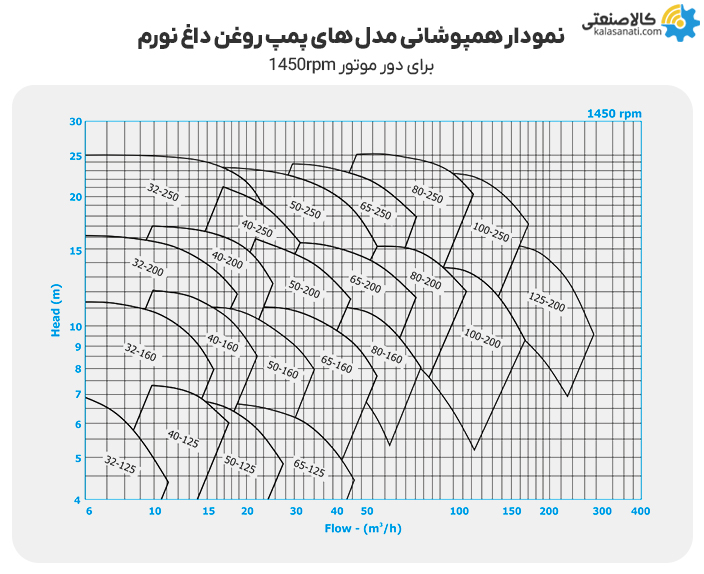 برای انتخاب پمپ و الکتروموتور باید نمودار هد برحسب دبی پمپ (منحنی عملکرد پمپ) برای الکتروموتور 1450 دور و 2900 دور بررسی شود. در شکل زیر برای دو دور موتور ذکر شده، منحنی همپوشانی پمپ روغن داغ نورم آورده شده است. با داشتن دو پارامتر هد و دبی مدل پمپ روغن داغ نورم انتخاب میشود.