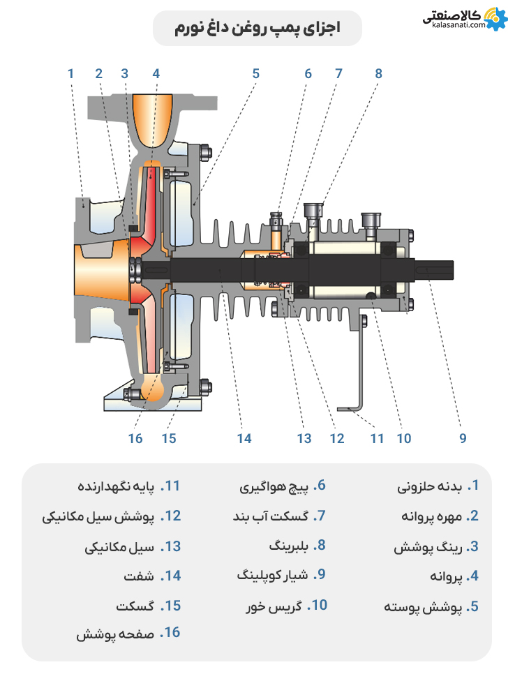 پمپ روغن داغ نورم اجزای مختلفی دارد که در شکل زیر تمام جزئیات آن آورده شده است. اجزای اصلی شامل پوسته پمپ، پروانه، پایه پمپ، صفحه پوشش پمپ، گسکتها، سیل مکانیکی، بلبرینگ و ... است.