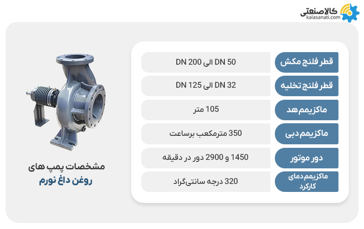 پمپهای روغن داغ نورم علاوه بر تحول فشار داخلی تا 16 بار، میتوانند سیال (روغن و آب با درجه حرارت بالا) تا دمای 350 درجه سانتیگراد را پمپاژ کنند، در برابر خوردگی و حرارت بسیار مقاوم هستند. سیل مکانیکیهای بکار رفته در این نوع پمپها از بهترین متریال بوده که پمپ را کاملا آببند میکنند و نسبت به سایر پمپهای سانتریفیوژ معمولی نشتی کمتری دارند.