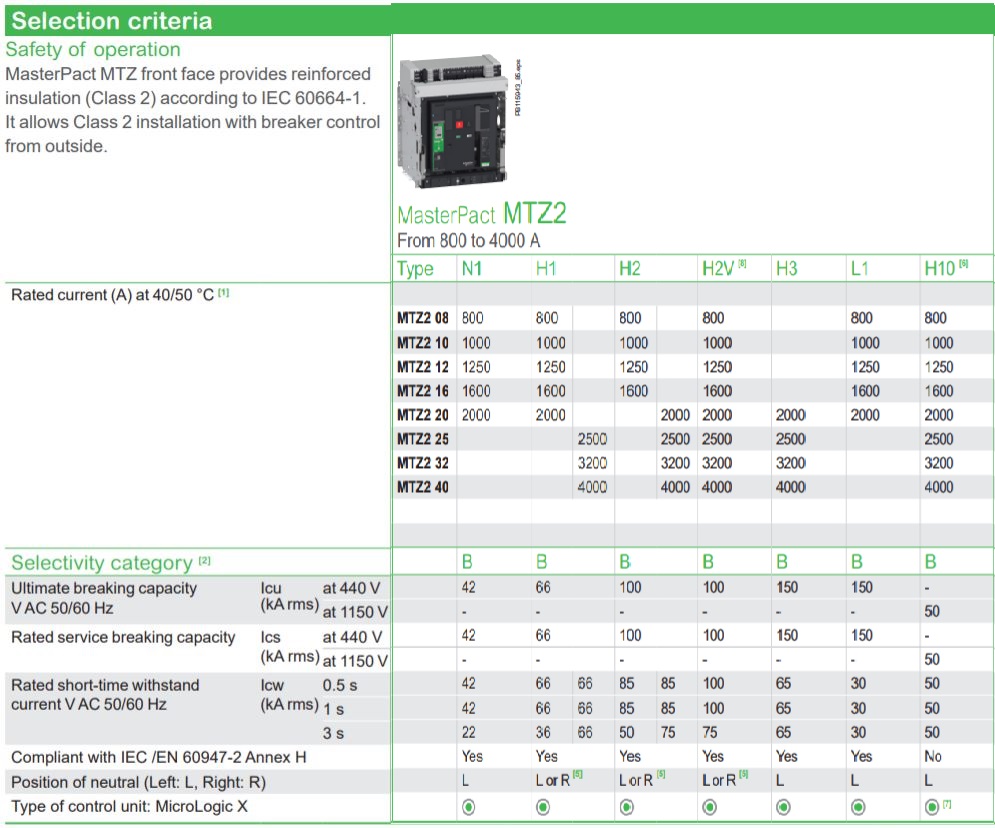 3 اندازه فیزیکی: MasterPact MTZ1 از 630 تا 1600 A. MasterPact MTZ2 از 800 تا 4000 A. MasterPact MTZ3 از 4000 تا 6300 A