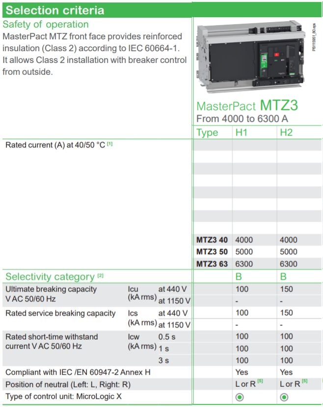 3 اندازه فیزیکی: MasterPact MTZ1 از 630 تا 1600 A. MasterPact MTZ2 از 800 تا 4000 A. MasterPact MTZ3 از 4000 تا 6300 A