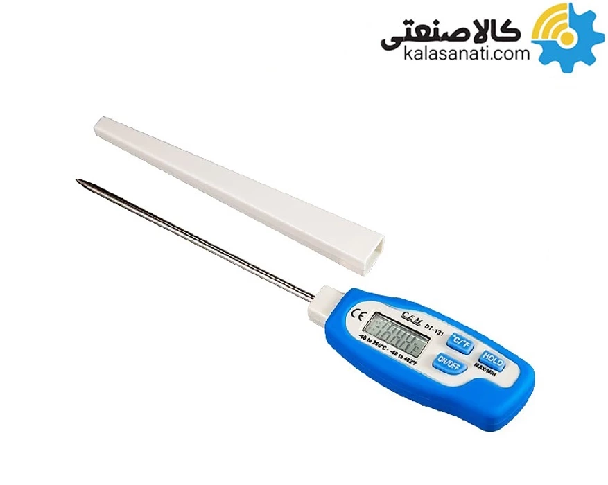 دماسنج دیجیتال نفوذی DT-131 محصول کمپانی CEM، با زمان پاسخ سریع و دقت بالای آزمایشگاهی برای اندازه گیری دما در محدوده -40 تا +250 درجه سانتیگراد استفاده می شود. این محصول دارای کاور مقاوم است و به خوبی از ترمومتر محافظت می کند. استفاده از این دستگاه بسیار ساده بوده و فقط کافی است کاور ترمومتر را بیرون آورده و دکمه OFF/ON را فشرده و درون محیط مورد نظر نفوذ دهید تا دما را برحسب سانتی گراد و فاراد روی صفحه LCD نمایش داده شود. دقت این دستگاه 1ºC± بوده و امکان HOLD مقادیر را دارد. وزن این دستگاه 130 گرم و ابعاد آن 150mm*40mm*28mm است.