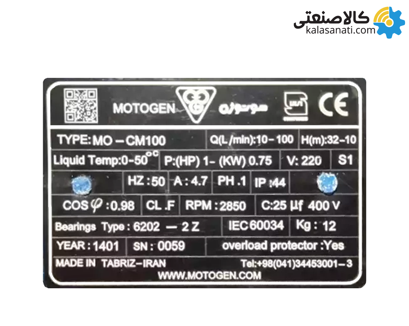 پمپ آب بشقابی مدل CM100 از برند موتوژن، مطابق با استاندارد IEC طراحی و تولید شده و در بازار عرضه میگردد. این پمپ دارای درجه حفاظت IP44 میباشد. طراحی پروانه خنککننده و پرههای روتور به بهبود عملکرد سیستم خنکسازی پمپ کمک میکند. کلاس حرارتی آن از گروه F بوده و برای کار با برق شهری با فرکانس 50 هرتز و ولتاژ 220 ولت مناسب است.