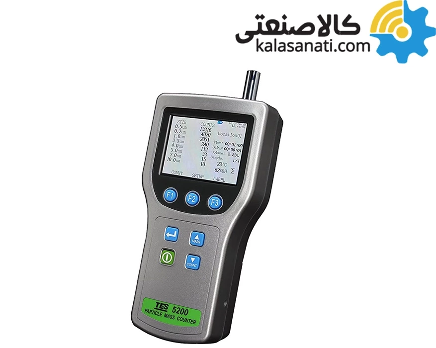پارتیکل کانتر 8 کانال TES مدل TES-5200 یک تجهیز پرتابل جهت پایش حجمی وشمارنده ذرات می باشد که دارای دو مد اندازه گیری count mode و حالت mass mode می باشد که در حالت اندازه گیری count mode توانایی اندازه گیری تعداد ذرات در اندازه های 0.5µm ,0.7µm ,1.0µm ,2.5µm ,4.0µm ,5.0µm ,7.0µm ,10µm و در حالت mass mode (تراکم جرم) قابلیت اندازه گیری تراکم حجمی طبق استاندارد های PM1, PM2.5, PM 4, PM 7, PM 10, TSP را دارد.