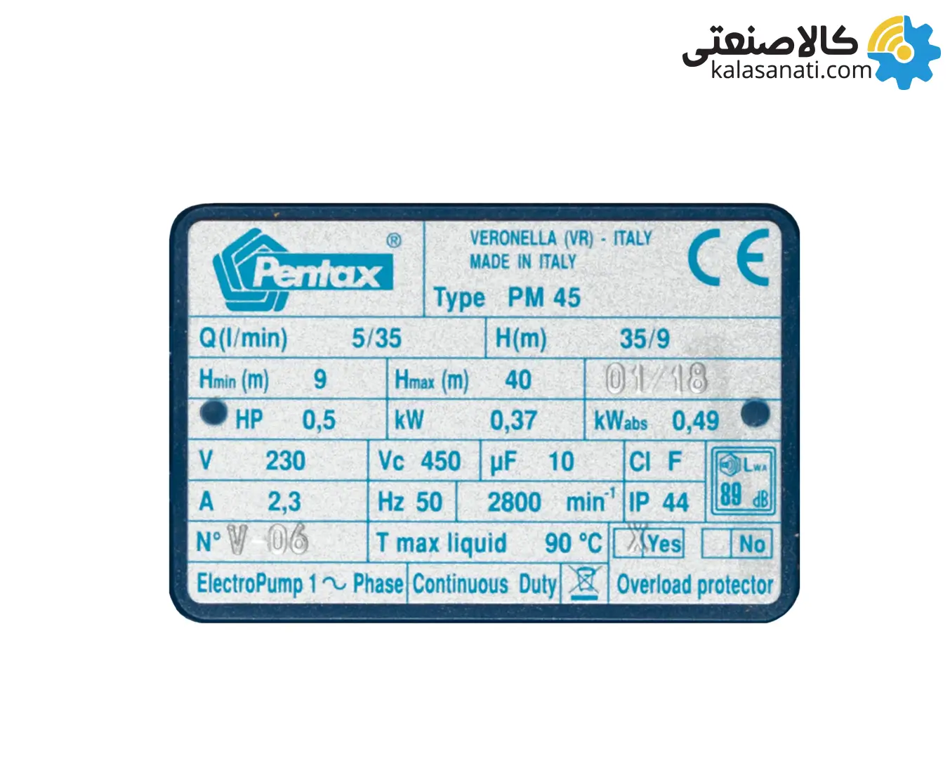 پمپ آب محیطی Pentax پنتاکس اصل 0.5 اسب تکفاز مدل PM45