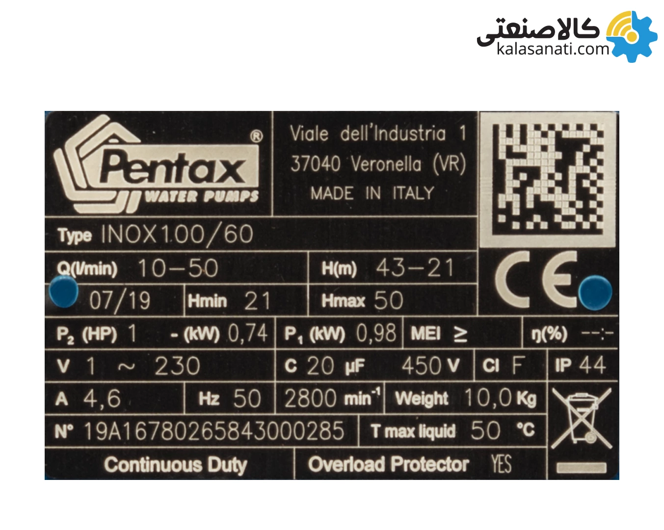جنس بدن پمپ INOX 100/60 پنتاکس از استینلس استیل AISI 304، جنس مکانیکال سیل پمپ از سرامیک/گرافیت است، جنس براکت موتور پمپ INOX 100/60 پنتاکس از آلومینیوم است، جنس شافت موتور پمپ از استینلس استیل 416 AISI است، جنس پروانه پمپ INOX 100/60 پنتاکس از نوریل (پلاستیک مهندسی) یا استینلس استیل AISI 304 است. قطر دهانه ورودی و خروجی پمپ INOX 100/60 پنتاکس یکسان بوده و برابر یک اینچ است، ابعاد جعبه پمپ به این صورت است دارای طول 400 میلی متر و عرض 210 میلی متر هم چنین ارتفاع پمپ برابر 235 میلی متر است، فاصله از مرکز دهانه ورودی تا زیر پمپ نیز برابر با 150 میلی متر است، فاصله دهانه ورودی تا دهانه خروجی پمپ INOX 100/60 پنتاکس برابر 79 میلی متر است، وزن پمپ INOX 100/60 پنتاکس برابر 8.7 کیلو گرم است، موتور پمپ دو قطبی القایی است این به معنی این است که سرعت دوران موتور 3000 دور است. برای دریافت قیمت و دریافت پمپ آب جتی پنتاکس با کارشناسان فروش در تماس باشید.