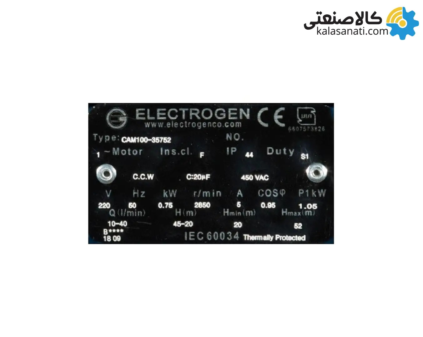 پمپ CAM100 الکتروژن دارای یک موتور القایی دوقطبی تک فاز است. جنس بدنه موتور از آلومینیوم بوده که به خنک کاری آن کمک شایانی خواهد کرد و این در حالی است که جنس پوسته خود پمپ از چدن است که در برابر ضربه، یخ زدگی و شکست مقاومت بیشتری دارد. همچنین شفت پمپ با استفاده از فولاد ضدزنگ ساختهشده و آببند مکانیکی آن نیز از جنس سرامیک یا کربن در نظر گرفته میشود. به دلیل اهمیت محافظ در برابر پاشش آب و نفوذ گرد و خاک، این محصول با درجه حفاظت IP44 بوده همچنین کلاس عایق بهکار رفته در پمپ CAM100، کلاس F است.