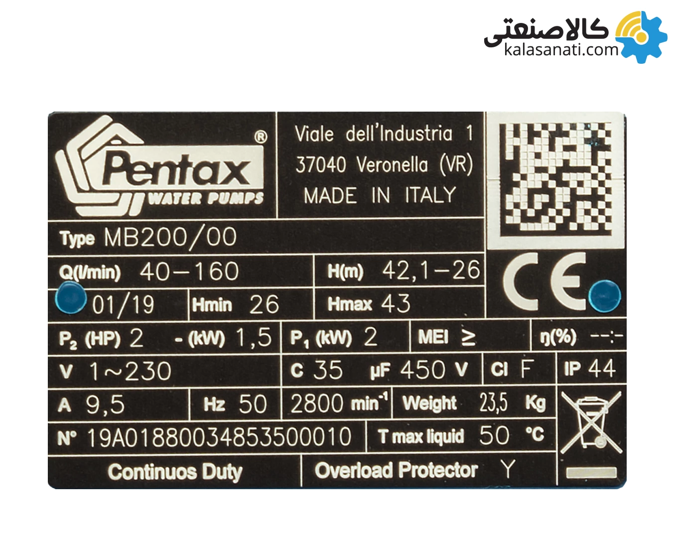 پمپ 200 MB پنتاکس در دو مدل تک فاز و سه فاز می باشد و در مدل تک فاز قابلیت اجرا شدن با برق شهری را دارد دارای توان 2 اسب بخار معادل 1.5 کیلو وات می باشد، توان پمپ در مدل تک فاز با سه فاز یک مقدار کمی فرق می کند و در مدل تک فاز مقدار توان پمپ بیشتر است ماکزیمم دمای سیال ورودی به پمپ 200 MB پنتاکس در محدوده دمای بین صفر تا 50 درجه می باشد، ماکزیمم دبی پمپ 200 MB پنتاکس برابر 200 لیتر بر دقیقه می باشد و در حداقل دبی دارای ماکزیمم هد 43 متر است، و در دبی 40 لیتر بردقیقه تا ارتفاع 41.5 متر جوابگو است. پمپ 200 MB پنتاکس دارای کلاس حرارتی F و درجه حفاظتی IP44 می باشد، توانایی ایجاد 8 بار فشار را دارد و حداکثر مکش پمپ 200 MB پنتاکس 8 متر است. هم چنین آمپر پمپ در مدل تک فاز برای فرکانس 50 هرتز برابر (230V×1) و در مدل سه فاز برای فرکانس 50 هرتز برابر (400V×3) است .