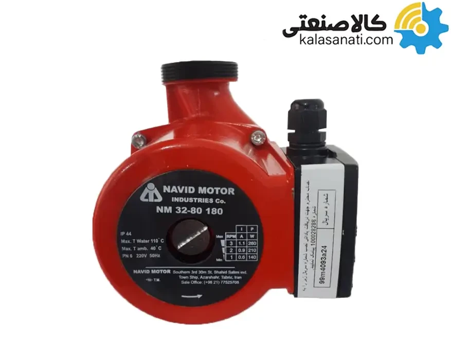 این پمپ IP44 بوده و دارای دمای بیشینه 110 درجه سانتی گراد و کمینه 40 درجه سانتی گراد است. امکان بستن این پمپ با برق تکفاز وجود دارد و با برق 50 هرتز قابل راه اندازی است. پمپ سیرکولاتور نوید موتور سری 32-80 180 دارای سه دور است که توان های 140 وات 210 وات و 260 وات را با آمپر نهایی 1.1 مصرف میکند. قطر دهانه ورودی پمپ 2 اینچ و قطر دهانه خروجی پمپ 1 و 1/4 اینچ است که یکی از مهم ترین ویژگی های پمپ هایی از نوع سیرکولاتر است. منبع انرژی مورد استفاده این پمپ برق تک فاز است. همچنین نوعی پمپ آب خانگی محسوب میشود. این پمپ در تبریز تولید شده و به سراسر ایران تولید می شود. برای شهر های مشهد و تهران بوسیله پرداخت در محل قابل تحویل است.
