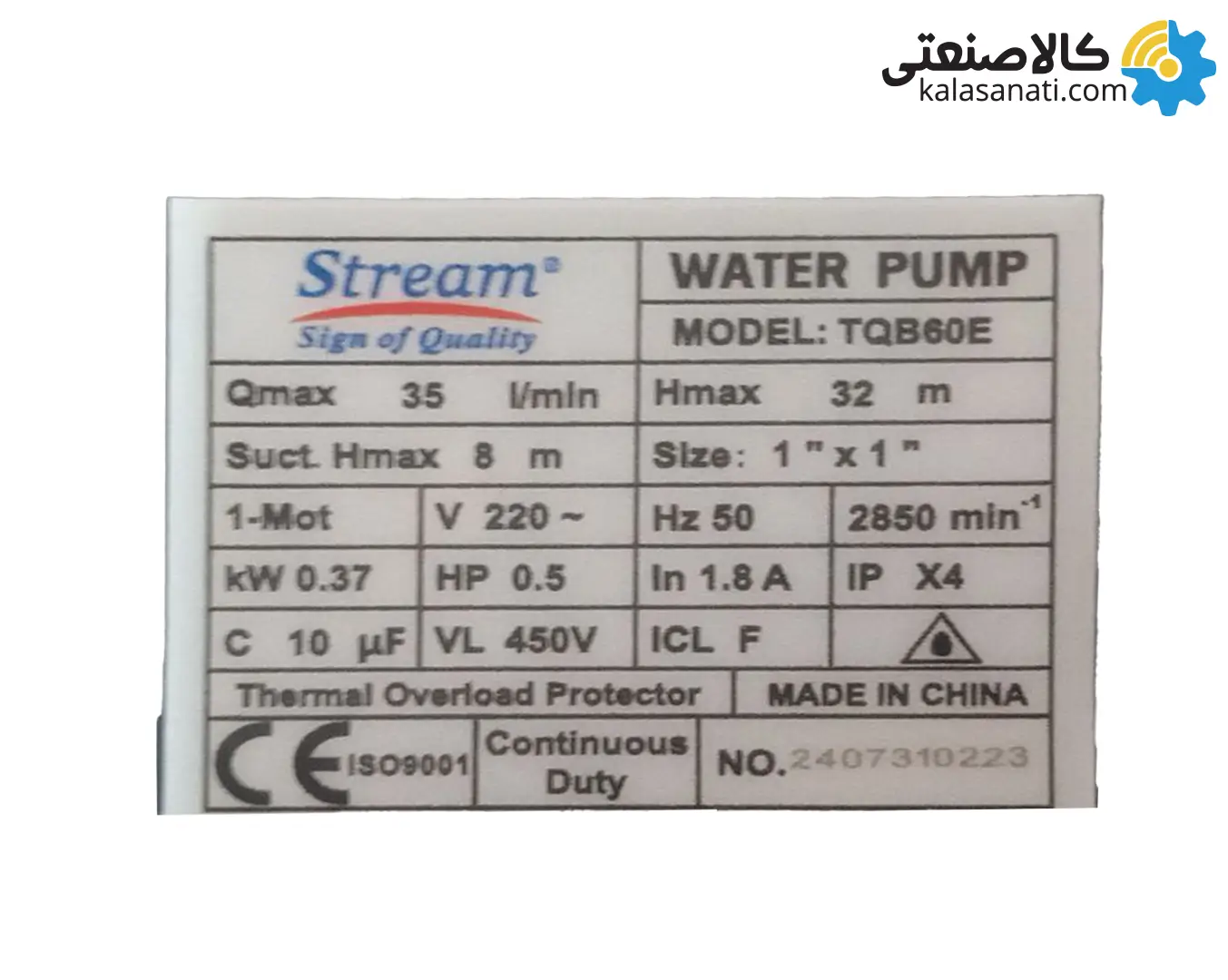 مشخصات فنی پمپ نیم اسب محیطی استریم مدل TQB60E