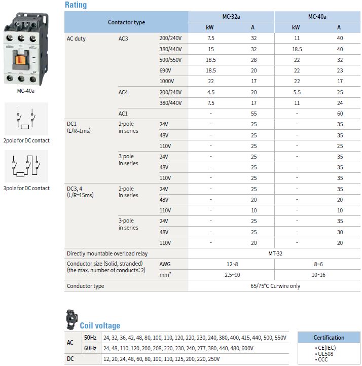 خانواده 40AF شامل دو کنتاکتور (MC-32a , MC-40a) با مشخصات زیر است: