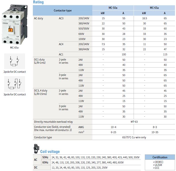 خانواده 65AF شامل دو کنتاکتور (MC-50a , MC-65a) با مشخصات زیر است: