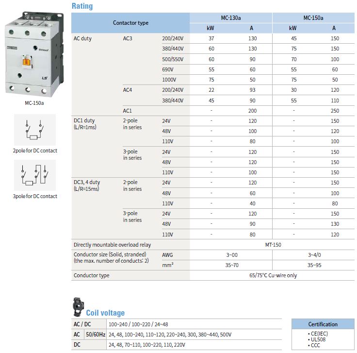 خانواده 150AF شامل دو کنتاکتور (MC-130a , MC-150a) با مشخصات زیر است: