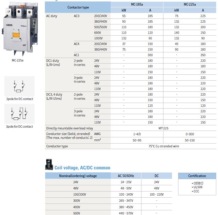 خانواده 225AF شامل دو کنتاکتور (MC-185a , MC-225a) با مشخصات زیر است: