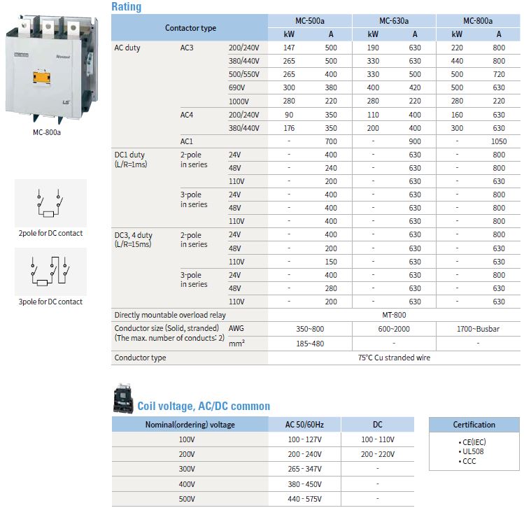 خانواده 800AF شامل چهار کنتاکتور (MC-500a , MC-630a , MC-800a) با مشخصات زیر است: