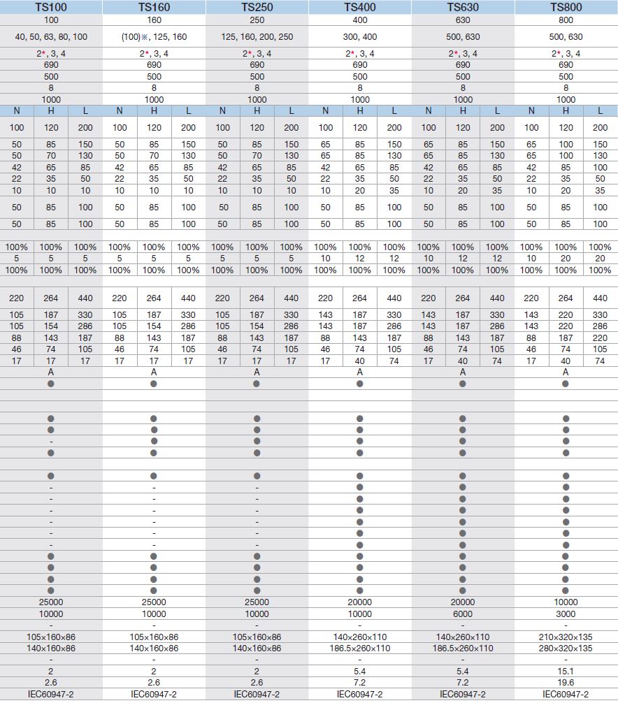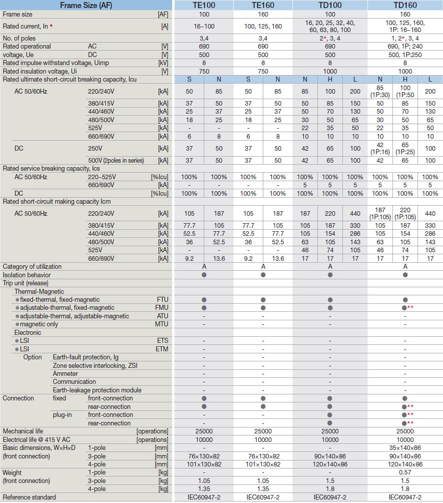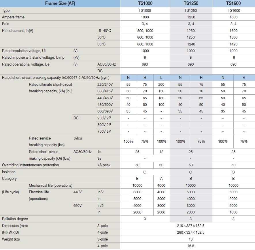 جریان : 100AF, 160AF, 250AF, 400AF, 600AF, 800AF, 1000AF, 1250AF, 1600AF