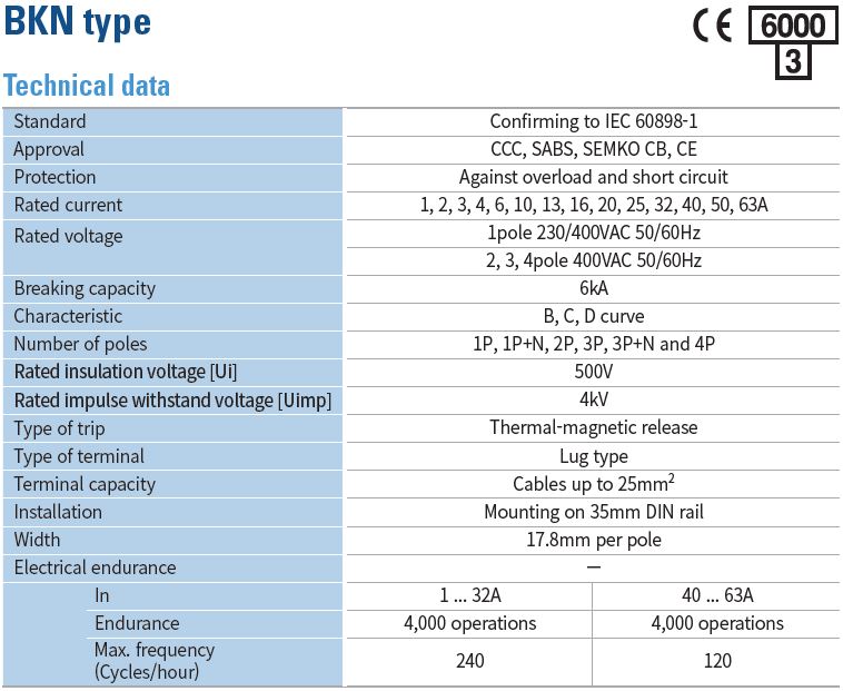 رنج جریانی 1A, 2A, 3A, 4A, 6A, 10A, 13A, 16A, 20A, 25A, 32A, 40A, 50A, 63A با استاندارد 6kA (IEC60898-1)