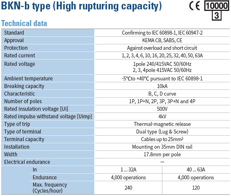 رنج جریانی 1A, 2A, 3A, 4A, 6A, 10A, 13A, 16A, 20A, 25A, 32A, 40A, 50A, 63A با استاندارد 6kA (IEC60898-1)
