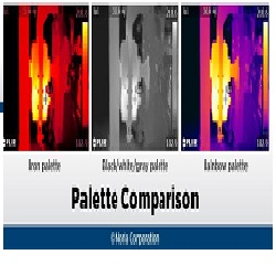 پالت آهن رایج ترین است. این قسمت سردترین مناطق را به رنگ مشکی ، مناطق کمی گرمتر را به رنگ آبی/بنفش ، دمای متوسط را به رنگ قرمز/نارنجی/زرد و سفید برای گرمترین دما نشان می دهد.