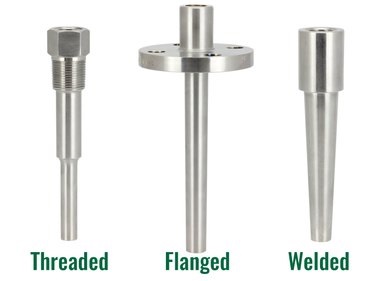 Thermowell که مستقیماً در سیستم های لوله کشی نصب می شود، از نظر نوع اتصال آن به لوله (pipe) میتوان به سه روش جوشی، پیچی و فلنجی اشاره کرد. که روش اتصال، به نوع پایپینگ (piping: لوله کشی صنعتی) بستگی دارد. اندازه و نوع فلنج در فلنجی، نوع رزوه در پیچی و دیگر ویژگیها، با توجه به نوع سنسور دما و دیگر ملزومات پروژه انتخاب میشود.