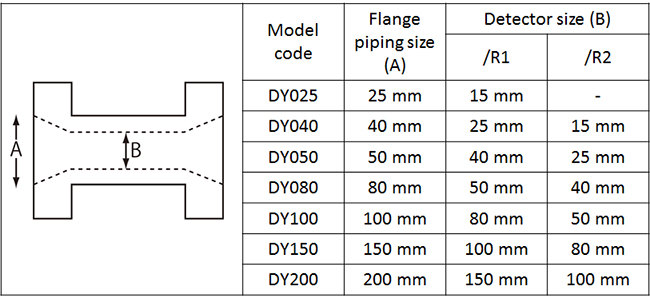 نوع حفره کاهش یافته در دو مشخصات کاهنده (/R1 و /R2) موجود است تا بسته به کاربرد قابل استفاده باشد. قطر اسمی قسمت تشخیص در مقایسه با قطر اسمی لوله‌کشی فلنج، 1 سایز پایین برای /R1 و 2 اندازه پایین برای /R2 کاهش می‌یابد. رابطه بین قطر اسمی لوله فلنج و قطر اسمی آشکارساز در زیر نشان داده شده است.